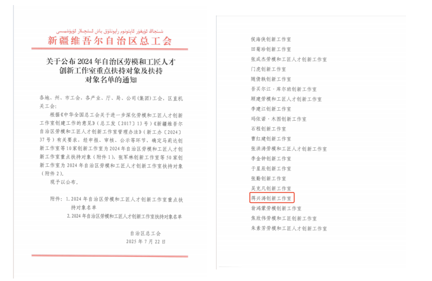 喜訊!“蔣興濤創(chuàng)新工作室”成功入選2024年自治區勞模和工匠人才創(chuàng)新工作室扶持名單?